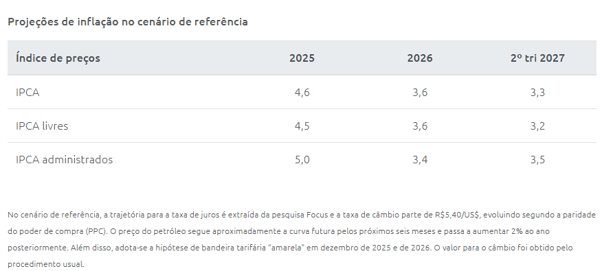 As expectativas de inflação para 2025 e 2026 apuradas pela pesquisa Focus permanecem em valores acima da meta, situando-se em 4,5% e 4,2%, respectivamente. A projeção de inflação do Copom para o segundo trimestre de 2027, atual horizonte relevante de política monetária, situa-se em 3,3% no cenário de referência (Tabela 1).
