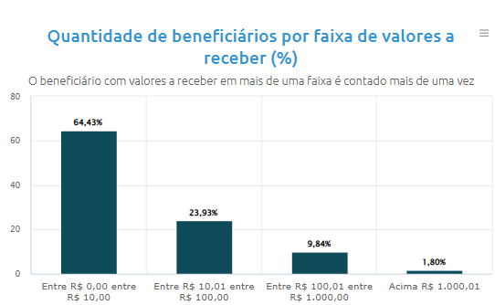 Grande parte das pessoas (64%), tem até R$ 10 para resgatar. Outros cerca de 24% tem até R$ 100, 10% até R$ 1 mil e apenas 1,8% acima de R$ 1 mil.