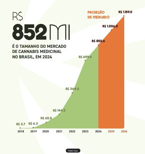 A consultoria Kaya Mynd calcula que o mercado de cannabis medicinal no Brasil seja em torno de R$ 852 milhões, conforme levantamento de 2024. A projeção é que passe de R$ 1 bilhão em 2026. Pelo levantamento da Kaya, 33 empresas no Brasil detém 80% do mercado de importações de cannabis medicinal no país, mas a tendência é de que a concorrência aumente conforme cresce o número de pacientes e melhore avance a regulamentação na Anvisa para esse tipo de produto.