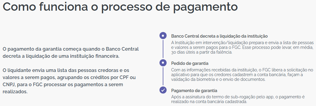 Em comunicado, o FGC, cuja principal fonte de recursos são as contribuições periódicas das instituições financeiras associadas, disse que o pagamento da garantia será feito após o envio da base pelo liquidante indicado pelo Banco Central.