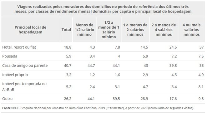 A tipo de hospedagem mais comum no país é a casa de amigo ou parente, com participação de 40,7% no total das viagens realizadas no ano passado. Em segundo lugar ficaram os hotéis e resorts, com 18,8%. Os imóveis por temporada, inclusive aqueles por aplicativo de internet, alcançaram 5,2% das viagens. Já as pousadas foram utilizadas em 5,9% das viagens. Apenas em 3,2% das viagens a hospedagem aconteceu em imóvel próprio.