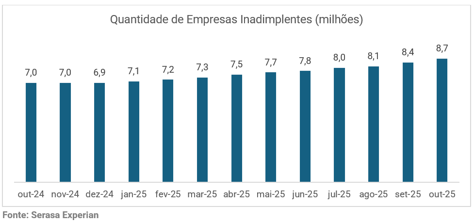 A situação é mais grave entre as micro, pequenas e médias empresas, que “sentem mais rapidamente os impactos dos juros altos e das incertezas do cenário internacional”, segundo Abdelmalack. Do total de 8,7 milhões de companhias inadimplentes em outubro de 2025, 8,2 milhões pertencem a esta classificação. Juntas, somam R$ 184,6 bilhões em contas inadimplidas.
