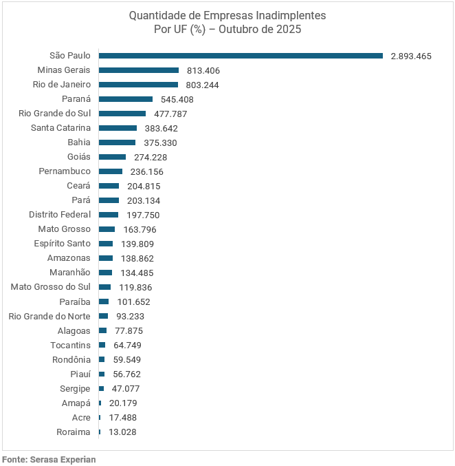 Os menores índices de empresas negativadas são encontrados no Centro-Oeste, com cerca de 755 mil ocorrências, e no Norte, que contabiliza aproximadamente 516 mil companhias no vermelho. Embora os números brutos nessas áreas sejam inferiores aos das demais regiões brasileiras, o cenário exige atenção para a saúde financeira dos negócios locais. Confira a seguir a distribuição detalhada por cada Unidade Federativa (UF):