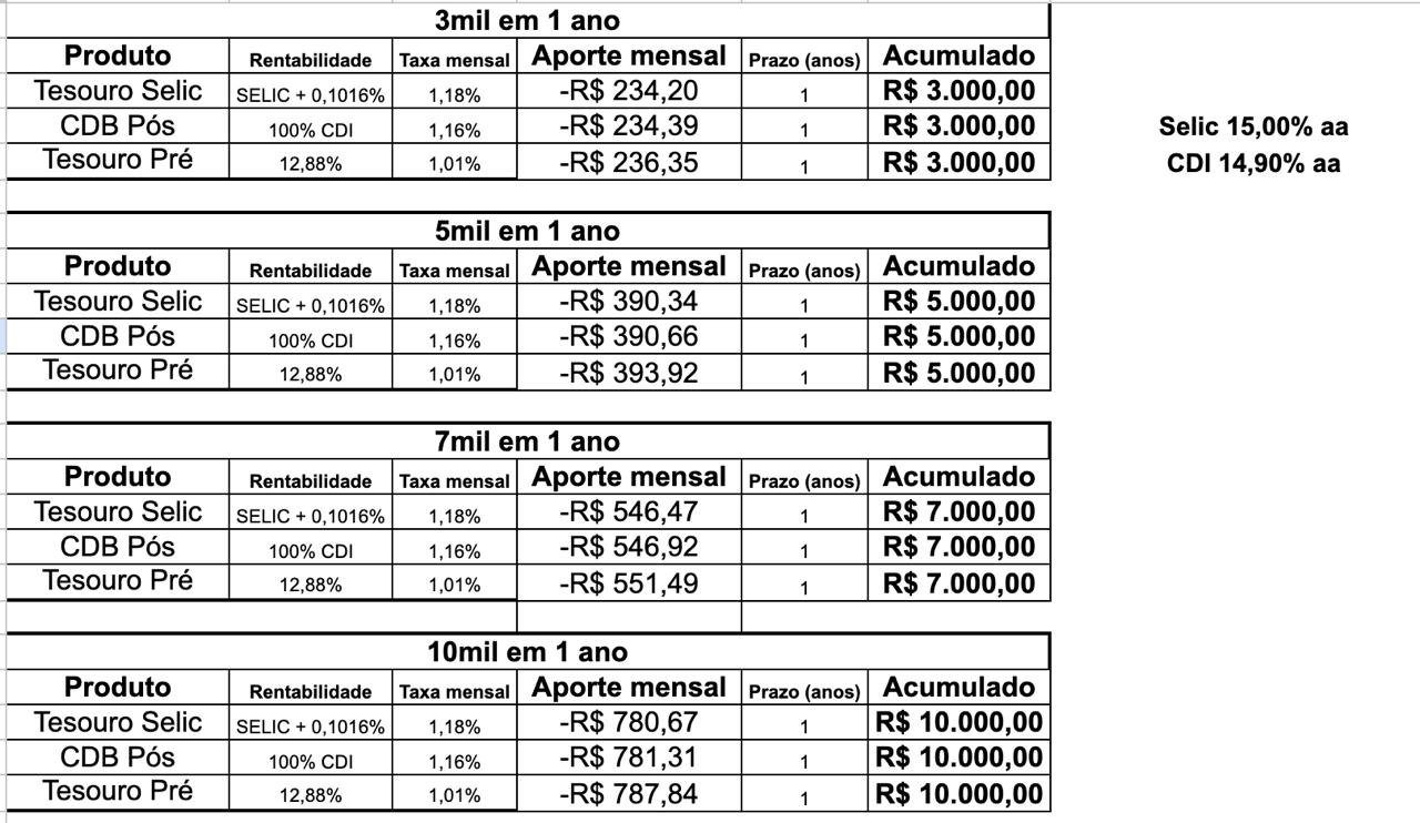 A pedido da IstoÉ Dinheiro, Patzlaff calculou quanto que um trabalhador precisa investir por mês para juntar R$ 3 mil, R$ 5 mil, R$ 7 mil e R$ 10 mil em um ano. Os valores levam em conta a Selic em 15% e o CDI em 14,90% ao ano.