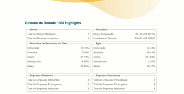 A Karoon levou 100% do bloco Esmeralda. Já o consórcio entre CNOOC e Sinopec conquistou o bloco Ametista, e a Equinor o bloco Itaimbezinho.