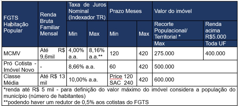 Nas condições do MCMV, as famílias com renda bruta mensal até R$ 9,6 mil, terão condições de financiamento com taxa de juros nominal variando entre 4% e 8,16% ao ano e prazo mínimo de 120 meses e máximo de 420 meses.
