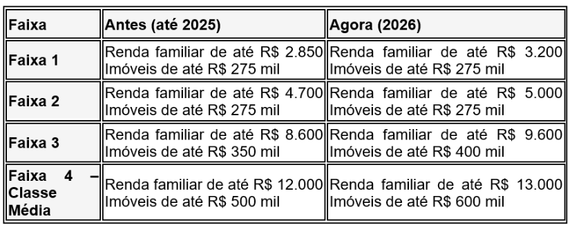 Na Faixa 3, o valor teto dos imóveis financiáveis subiu de R$ 350 mil para R$ 400 mil e a renda familiar foi elevada de R$ 8,6 mil para R$ 9,6 mil. Na Faixa 4 (Classe Média), o valor teto dos imóveis financiáveis saiu de R$ 500 mil para R$ 600 mil e a renda familiar também foi elevada de R$ 12 mil para R$ 13 mil.
