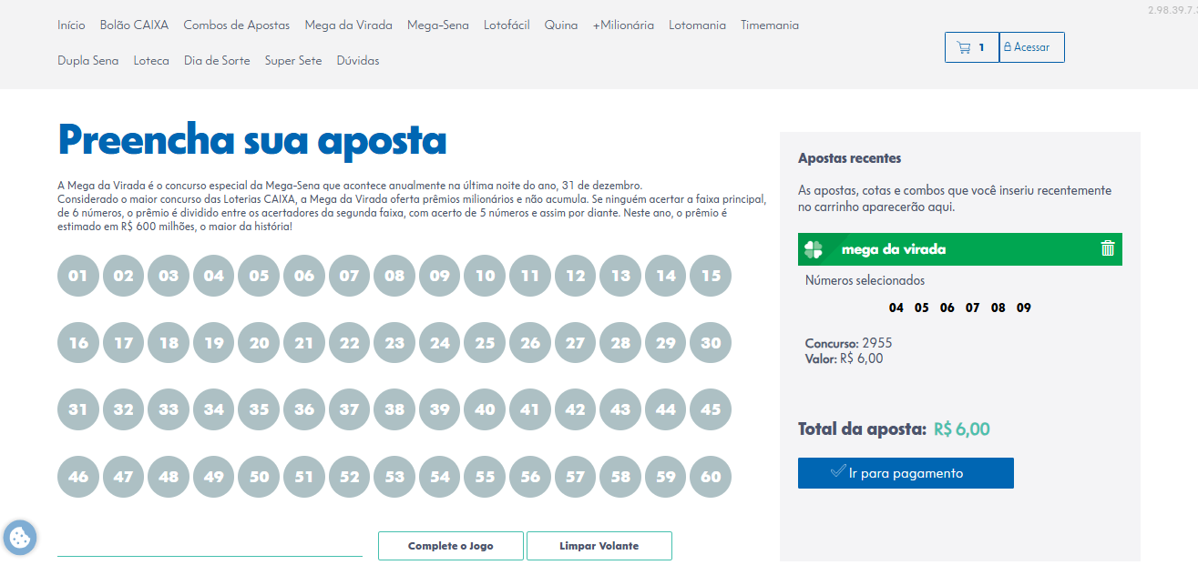 Na página inicial, o concurso especial fica em destaque ao longo de dezembro. Basta selecionar a Mega da Virada para abrir o volante digital e escolher os números.