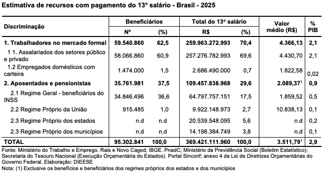 Dos brasileiros que devem ser beneficiados com o pagamento do 13º salário, 59,5 milhões, ou 62,5% do total, são trabalhadores no mercado formal. Os aposentados ou pensionistas da Previdência Social (INSS) correspondem a 34,8 milhões de beneficiários, ou 36,6% do total. Além desses, aproximadamente 915,5 mil pessoas (ou 1,0% do total) são aposentadas e beneficiárias de pensão da União (Regime Próprio).