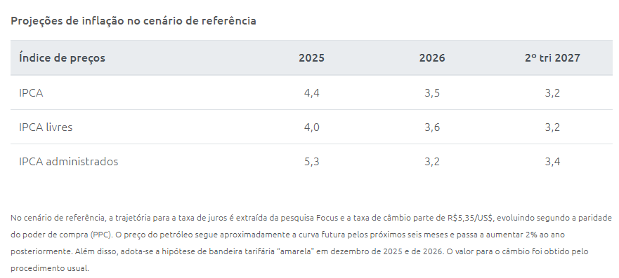As expectativas de inflação para 2025 e 2026 apuradas pela pesquisa Focus permanecem em valores acima da meta, situando-se em 4,4% e 4,2%, respectivamente. A projeção de inflação do Copom para o segundo trimestre de 2027, atual horizonte relevante de política monetária, situa-se em 3,2% no cenário de referência (Tabela 1).