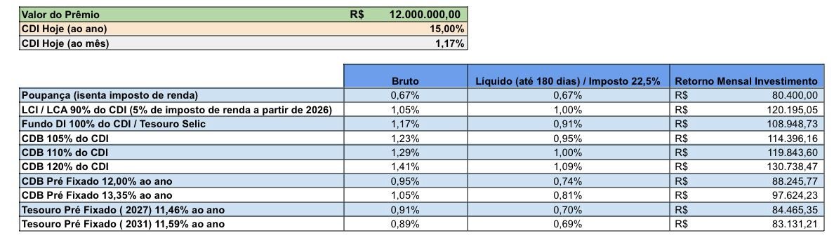 Como é possível avaliar na simulação, os R$ 12 milhões do prêmio, se investidos em LCI/LCA com 90% do CDI, renderiam ao investidor um valor superior a R$ 120,1 mil por mês. Até este ano, essa modalidade é isenta de imposto de renda, assim como a poupança. Se aportados no Fundo DI 100% do CDI, o prêmio geraria um rendimento mensal de R$ 108,9 mil por mês.