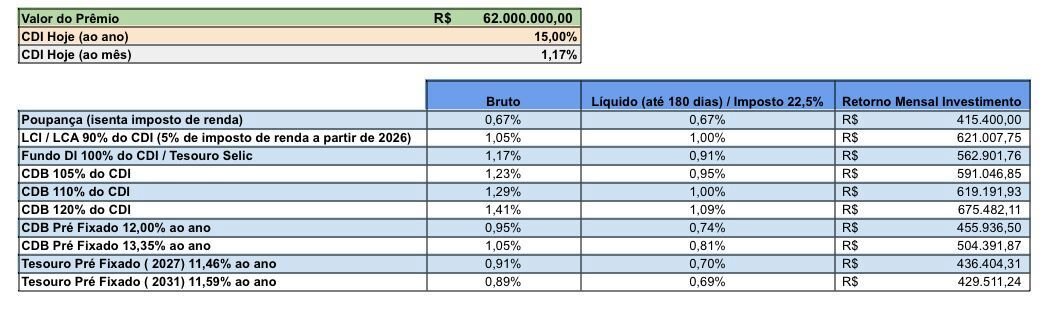 Como é possível avaliar na simulação, os R$ 62 milhões do prêmio, se investidos em LCI/LCA com 90% do CDI, renderiam ao investidor um valor superior a R$ 621 mil por mês. Até o fim do ano, essa modalidade é isenta de imposto de renda, assim como a poupança. Se aportados no Fundo DI 100% do CDI, o prêmio geraria um rendimento mensal de R$ 532,9 mil por mês.