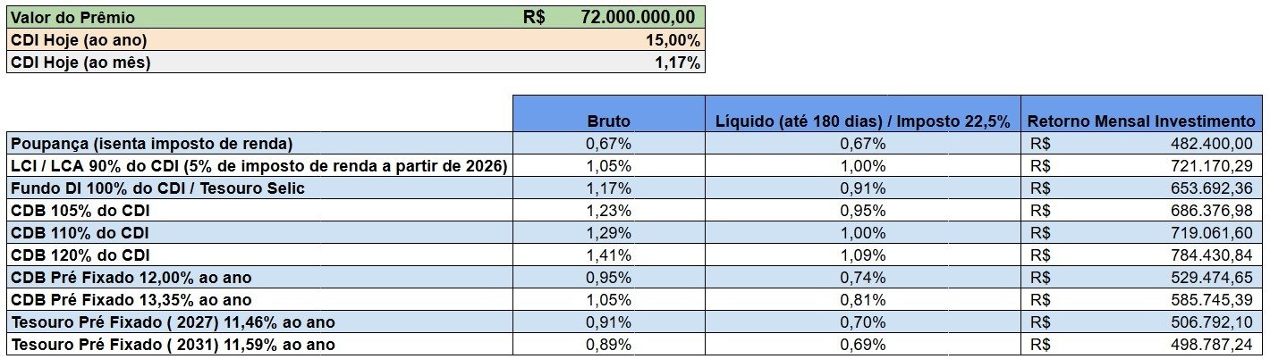 Como é possível avaliar na simulação, os R$ 72 milhões do prêmio, se investidos em LCI/LCA com 90% do CDI, renderiam ao investidor R$ 721,1 mil por mês. Se aportados no Fundo DI 100% do CDI, o prêmio geraria um rendimento mensal de R$ 653,6 mil por mês.